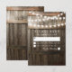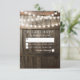 Tarjeta de confirmación de boda Cadena de luces | Fondo de barril de roble oscuro de granero campestre, luces de cadena brillantes y texto de boda moderno. Encuentre otras tarjetas de confirmación de boda de patio de granero en http://www.zazzle.com/special_stationery
