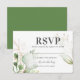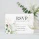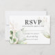 Tarjetas de respuesta de boda de eucalipto elegante con un fondo blanco clásico, una moderna exhibición de acuarela de follaje verde de bosque, acentos florales dorados de moda y una plantilla de RSVP elegante que es fácil de personalizar.