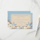 Una hermosa tarjeta de respuesta de confirmación de boda con un tema de playa exótico. Un bonito patrón de textura de arena en tonos crema neutros y tonos de azul océano está salpicado con muchas piedrecitas de playa. Encima de las piedras hay una variedad de conchas marinas, erizos de mar, estrellas de mar y perlas.