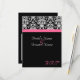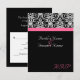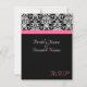 Tarjeta de confirmación de asistencia para combinar con nuestra invitación de boda de fondo negro elegante con acento rosa magenta fucsia. Fondo negro fresco y elegante con acento de damasco en blanco y negro, y franja horizontal de acento de color. Personalice en línea con los detalles de su boda.