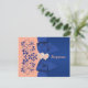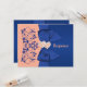 Esta elegante y romántica tarjeta de respuesta para boda con flores de durazno y azul real tiene una cinta y lazo IMPRIMIDOS con un par de joyas de diamante IMPRIMIDAS y corazones unidos con brillo FALSO que coinciden con la invitación de boda que se muestra a continuación. ****POR FAVOR TOME NOTA de que no hay imágenes en relieve o estampadas en esta tarjeta. TAMBIÉN, Zazzle NO editará nada para corregir errores tipográficos o alineación o espaciado, así que por favor asegúrese de que su texto sea exactamente como lo desea. No veré su invitación, así que si necesita ayuda con la personalización de mi diseño, por favor envíeme un correo electrónico ANTES de realizar su pedido. Todo se imprime plano. Las opciones de texto y papel son totalmente personalizables, pero NO sugiero cambiar el papel a Kraft o metálico plateado, ya que son muy oscuros y alterarán la legibilidad y el aspecto del diseño