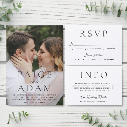 Modern editorial style wedding RSVP card with bold typography and your favorite photo. A clean and simple design for a wedding during any time of year.