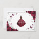 Burgundy silver and white Quinceanera RSVP reply card. Features brunette girl in ball gown dress, script font, silver butterflies, dark red roses and tiara. Perfect for an elegant princess style glam celebration. Personalize with your own details.