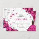 Fuchsia pink silver and white Quinceanera RSVP reply card. Features brunette girl in ball gown dress, script font, silver butterflies, hot pink roses and tiara. Perfect for an elegant princess style glam celebration. Personalize with your own details.