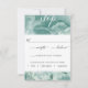 Elegante tarjeta RSVP con exquisito fondo de color verde azul en la parte delantera y trasera. Acuarela en una delicada mezcla de turquesa, verde azulada, bruma, azul hielo, salvia, eucalipto, azul, menta y azul gris. Capacidad de cambiar la sección de opciones de comidas para cualquier otro mensaje o pregunta. Uso de caligrafía escrita a mano moderna y tipografía en bloques. Parte de nuestra colección "Blue Green Watercolor, Fine Drawing Botanical".