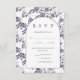 Sencilla y elegante tarjeta rsvp de boda presenta un hermoso patrón botánico de color violeta en la parte posterior, y la tipografía clásica en negrita rsvp en el frente blanco de la tarjeta. La elección de la comida y la fecha de respuesta se incluyen en el texto editable.