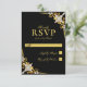 Tarjeta RSVP de Boda Dorada y Negra de moda de lujo con escritura caligráfica y diseño de acento de joyas de oro.
