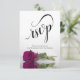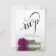 Estas hermosas tarjetas RSVP harán que sea más fácil para sus invitados responder a su invitación a la boda. Presentan un diseño elegante con caligrafía de escritura sofisticada y un único rosa morado, magenta o de color berry de cassis de tallo largo que refleja un estanque de agua con olas y ondas. La parte posterior de la tarjeta es un formulario que los clientes deben rellenar y devolver en el que se indica si pueden asistir o no, el número de clientes que traen y la elección de las comidas. También hay espacio para un sitio web para que sus huéspedes puedan responder en línea si les resulta más conveniente.