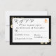 El diseño presenta un elegante fondo negro con rosas sepia rodeando un rectángulo blanco que muestra texto. El texto se muestra en el formato adecuado para una tarjeta de respuesta. La parte posterior muestra una gran imagen de un hermoso rosa sepia sobre un fondo negro. Una cruz dorada entrelazada con dos anillos bodas aparece en la esquina superior derecha. El diseño es muy agradable a la vista.