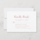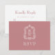 Esta elegante tarjeta RSVP matrimonial incluye un par de iniciales blancas de monograma enmarcadas por un escudo de coronas de hoja de acanthus sobre un fondo de rosa polvoriento. El texto combina fuentes serif abiertas y sans serif clásicas. En el lado inverso aparece el texto rosa polvoriento sobre un fondo blanco.