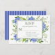 Esta encantadora y elegante tarjeta de RSVP con hermosas hortensias azules multicolores etéreas y un follaje verde impresionante y parte posterior a rayas azules coordinadas es perfecta para incluir con sus invitaciones. Sus invitados encontrarán fácil responder a su fiesta de compromiso. Puede hacerla suya fácilmente seleccionando Personalizar esta plantilla y escribiendo la fecha límite para la respuesta. ¡En segundos verá sus tarjetas de RSVP únicas y deslumbrantes!