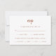 Estas elegantes y minimalistas tarjetas de respuesta boda presentan tipografía de escritura terracota y sans serif texto sobre fondo blanco, para un diseño simple y boho que te encantará. Hay espacio para añadir a sus huéspedes opciones para la elección de comidas o cenas.