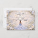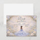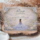 Este elegante diseño de quinceañera presenta un suave fondo de acuarela azul polvo enmarcado por delicadas rosas marfil, sutiles toques de vegetación y detalles ornamentados en dorado, con una ilustración de vestido que crea una atmósfera refinada y de cuento de hadas. La paleta de azules fríos combinada con flores románticas le da al diseño un toque atemporal y lujoso, perfecto para una celebración clásica de quinceañera con un estilo de jardín elegante.