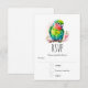 Una tarjeta RSVP con un lindo ilustracion de loro. Un pequeño loro verde con colores azules y amarillos que se mezclan. El cuello tiene una vibrante sombra de rosa rojizo.