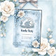Marco floral con Rosas y diseño celta. La imagen presenta un delicado marco floral con una estética suave y onírica. Las rosas blancas con centros beige sutiles y las hojas verde-azul mudas adornan las esquinas superior izquierda y inferior derecha. El marco en sí está construido con un diseño de inspiración celta y azul glacial. Un patrón de nudo celta circular débil es visible en el fondo.
