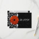 Elegante, chic y refinada colección de artículos que combina un fondo negro con sutiles volutas y un diseño de volutas blancas en primer plano con una vibrante flor de gerbera margarita naranja. Perfectamente elegante para una boda de otoño, una boda de Halloween, un evento de Acción de Gracias o en cualquier temporada.