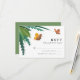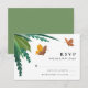 Esta elegante tarjeta de respuesta de boda presenta mariposas amarillas y naranjas (novia y novio) volando alrededor de follaje verde ilustrado en acuarela. La elección ideal para bodas de primavera y verano. Personalice la información de su respuesta en una mezcla de fuentes de letra de bloque tradicional y caligrafía moderna. La parte trasera de la tarjeta es verde claro.