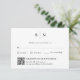 Estas elegantes y modernas tarjetas de respuesta RSVP para bodas presentan un sencillo diseño de texto en blanco y negro que exuda estilo minimalista. Añada sus iniciales o su monograma para hacerlas completamente propias. Esta tarjeta de respuesta boda sirve como una combinación tradicional rsvp que tu huésped puede devolver, así como un código QR para aquellos que prefieran rsvp en línea.