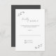 Una hermosa tarjeta de respuesta de boda de moda minimalista con los detalles de su boda en letras clásicas unidas y escritura moderna manuscrita con acento es perfecta para una elegante ceremonia de boda en el país de la moda. Enmarcado desde arriba y abajo por una sola rama botánica. El color de ceniza gris de la escritura y el fondo inverso hace una declaración clásica, aunque puede cambiarse si lo desea. Para crear su propia moda elegante tarjeta RSVP de boda minimalista, haga clic en el botón "Personalizar" y cambie la "por fecha" por la suya. Para personalizar de la paleta de colores, haga clic en "Editar más adelante".