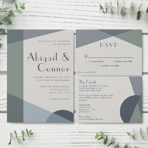 Elementos: formas geométricas abstractas, bloques de color, fuente sans serif de moda para nombres, tipos de letra serif subexpresados para detalles. Colores: salvia, menta, pistacho, evergreen, azul polvoriento, botánico, marina, noche, medianoche, cetáceo, pergamino, gris claro, platino. Temas: modernos, minimalistas, abstractos, limpios, alegres, fríos tonos, sobrios, boho, scandi, contemporáneo, industrial. Colección: Resumen de Moda Resumen Tipo de producto de la colección de Bodas azul turbio de la marina de salvia geométrica: RSVP