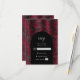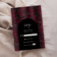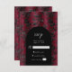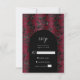 Este elegante diseño presenta una imagen de fondo humorístico de un patrón vintage de damasco floral de terciopelo falso en burdeos y negro. Las iniciales "rsvp" aparecen en un elegante guión de caligrafía gris plateada, con texto en personalizable y espacios para las respuestas de los clientes a continuación. En el reverso aparece un patrón de damasco negro y borgoña que coincide.