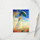 Tarjeta RSVP con la esposa de Claude Monet, Camille, sosteniendo una sombrilla verde mientras el viento sopla su velo azul en un campo verde y dorado. Un gran regalo de Monet para los amantes del impresionismo y el arte francés.