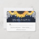 This navy blue and sunflower RSVP card featuring sunflower flowers on a rustic wood background adorned with white floral lace, burlap hearts and string lights is perfect for inviting your guests to your navy blue rustic wedding party inspired by sunflower flowers.