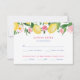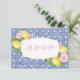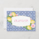 Tarjeta de respuesta RSVP para la elección de la comida con limones acuarelas y patrón de azulejo cobalto y blanco vintage. Este diseño contiene acentos rosados en forma de flores y texto rosado caliente.