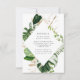 Elegantes y elegantes tarjetas de boda con detalles bodas rodeadas por un marco geométrico de hojas de monstera de color agua y Relieve metalizado de oro falso y follaje verde. Personalice la tarjeta agregando información importante, como detalles de la reserva de alojamiento, etc.
