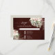 Tarjeta de respuesta RSVP de Orquídea Blanca Malhumorada Floral Tropical Burgundy para coordinar con nuestro conjunto completo de invitaciones de boda. El fondo de madera rústica manchada de azul marino oscuro es elegante y malhumorado cuando se combina con imágenes de acuarela pintadas a mano en un estilo bohemio floral con follaje de jungla seca y frondas de palma para una boda con tema de playa, tropical o junto al mar. Derechos de autor, artista conocida internacionalmente y licenciada, Audrey Jeanne Roberts.