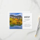 Tarjeta RSVP con una hermosa fotografía de campo. Montañas de piedra con un bosque otoñal en colores brillantes. Un lago tranquilo refleja las montañas, los árboles y las hierbas.