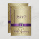 Celebre su aniversario de bodas con estilo con este elegante conjunto de Tarjeta de Respuesta para la Invitación de Aniversario de Bodas de 50 años con efecto damasco dorado, para la cual esta es la tarjeta de respuesta. Estas invitaciones elegantes son una mezcla maravillosa de tradicional y moderno. La gráfica computarizada le da a esta tarjeta una apariencia 3D, aunque la cinta de satén púrpura, el broche de oro y diamantes y el número 50 metálico dorado son solo imágenes fotográficas impresas en la tarjeta plana. Por favor, ordene en papel blanco liso como se muestra, para que todos los detalles del diseño resalten. En la parte posterior, agregue el texto de respuesta para la fiesta de su 50 aniversario. Esta tarjeta NO viene con ningún adorno. Todo lo que ve está impreso en una superficie de tarjeta plana. ¿Le gustaría un color de cinta diferente o ayuda con el diseño de su