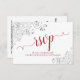 Estas hermosas tarjetas RSVP harán que sea más fácil para sus invitados responder a su invitación a la boda. Presentan un diseño elegante con una caligrafía de escritura roja sobre un fondo blanco, y rizos florales de color gris plateado y remolinos en las esquinas. La parte posterior de la tarjeta es un formulario que los clientes deben rellenar y devolver en el que se indica si pueden asistir o no, el número de clientes que traen y la elección de las comidas. También hay espacio para un sitio web para que sus huéspedes puedan responder en línea si les resulta más conveniente.