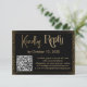 Utilizando dos tipos de letra distintivos, he creado gráficos para las piezas de esta colección y las he embellecido con un efecto de oro falso metálico para una vibración festiva. En este artículo, se usó una tipografía caprichosa, escrita a mano para representar "Amablemente" y la elaborada y formal dice "Responder". Todo el texto se colocó sobre un rectángulo negro que sobrepone un fondo negro. Confeti dorado y una sutil sombra oscura negra completan el efecto fronterizo. Utilice los campos de plantilla para agregar sus propios detalles para rutear el código QR e incluir información adicional de personalizado para sus invitados. Y puedes cambiar el fondo a cualquier color que quieras. // 130 + 131 //