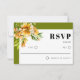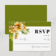 Rhododendron branch and orange yellow flowers fall wedding RSVP Card. This inspired by nature design showcases a slender rhododendron branch with gentle orange, yellow blossoms. Positioned in the upper‑left corner, the floral illustration adds a soft, romantic touch that instantly draws the eye. The text rests inside a clean white panel framed by delicate olive green edging, lending an understated elegance. The “RSVP” appears in bold, contemporary lettering, marrying modern flair with classic poise. An olive green background ties the whole composition together, creating a balanced palette that sets the perfect tone for your celebration.