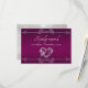 Design features an elegant plum (purple) background embellished with a delicate silver scroll heart and dividers. Stylish script place holders for the date are on the front, and response information on a white pearl back. Perfect for the simple to most elegant wedding. Also available with different colored backgrounds for your wedding theme colors. Designed to coordinate with the "Romantic Scroll Hearts & Calligraphy" Wedding Collection. To change details, click «Personalize». To move the text or change the text size, font, or color click «Click to customize further»