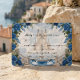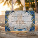 Transport your guests to a happily ever after. This enchanted design features a romantic castle illustration, perfect for a royal-themed luxury wedding.This design features a highly detailed digital illustration simulating a watercolor painting effect. The scene depicts a grand stone staircase leading up to a majestic storybook castle, flanked by a water fountain and two elegant white swans. The artwork is framed by deep navy blue roses and sage green foliage against a soft beige and dreamy blue cloud background. Text is rendered in a mix of traditional serif fonts and sweeping calligraphy.This is a flat printed image with a watercolor visual effect; it does not contain actual paint texture or raised foiling.