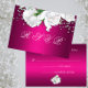 Una tarjeta RSVP de boda rosa oscuro muy bonito y colorida, con un lujoso ramo de novia rosa blanca en la parte delantera y un ramo blanco más pequeño al otro lado de la tarjeta de respuesta.