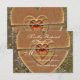 A rustic country wedding RSVP reply card featuring a rustic hunting camo design with three wooden hearts stacked on top of one another and tied together with a printed twine design. These wedding response cards can be customized with your own details. The twine is just a printed design, not actual twine. These are perfect for hunter weddings, hunting theme weddings, camo weddings and anyone using camouflage in their wedding decorations.