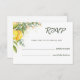 Tarjeta de confirmación de asistencia rústica con acuarela de limones y eucalipto. El estilo romántico con limones de acuarela, flores amarillas y eucalipto es perfecto para una boda rústica de verano. La salpicadura de acuarela complementa la composición y le da un encanto especial.