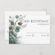 An elegant sage green eucalyptus wedding RSVP card with QR code for kindly reply. Features corner watercolor greenery and calligraphy script.