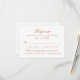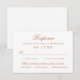 Complete su suite con esta tarjeta de RSVP de boda con cálido texto en cobre y tipografía serif refinada en un fondo blanco limpio. Incluye espacio para el nombre del invitado, selección de asistencia y una sección conveniente de elección de comida. Mínimo, atemporal y perfecto para bodas formales, tradicionales y modernas clásicas.