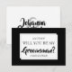 Cada novio necesita a sus mejores amigos a su lado en su día de bodas. Así que pídele que te defienda con esta tarjeta de proposición de groomsman. Presenta un diseño sencillo en blanco y negro que es formal en su redacción, pero utiliza un tipo llamativo y audaz, para que sea apropiado para cualquier situación. Incluye un espacio para escribir un mensaje especial.