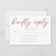 Esta tarjeta RSVP de bodas marrones de siena es un color regal cálido para una novia o novio que busca una mezcla entre suave y masculino. La escritura encantadora tan minimalista presenta una tipografía cursiva simple que lee Kindly Reply sobre una fuente serif moderna y moda. Esta colección flexible sirve para bodas de tarde y noche.