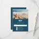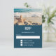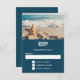 Tarjeta RSVP con una foto panorámica. Una gran estrella de mar colocada en una playa de arena fina. Un hermoso mar azul con olas de olas de surf blancas en el fondo.