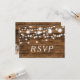 Un hermoso diseño de madera de granero rústico y encaje con una cadena de bonitas luces brillantes para estas tarjetas de respuesta de boda que personalizas para tu próximo día mágico.