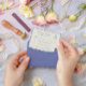 Tarjeta de respuesta floral con flores de sweet pea azules sobre fondo crema