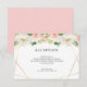 Tarjeta de recepción matrimonial con flores color rosa y marco geométrico.