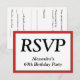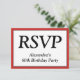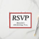 Este respetable y limpio diseño de tarjeta R.S.V.P incluye el mensaje "RSVP" en la parte delantera, junto con un nombre de ocasión personalizado. También incluye un formulario RSVP personalizado en la parte posterior para que el destinatario lo complete. Las tarjetas RSVP como esta podrían ser usadas para averiguar quién asistirá a una fiesta de graduación, un fiesta de cena, una recepción de boda o alguna otra celebración.