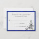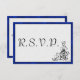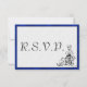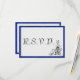 Un RSVP de bodas azules y blancas que tiene un tema elegante. Hay un borde azul (falso) de terciopelo que recorre el borde de la tarjeta de respuesta, y un elegante negro florece en la esquina inferior.